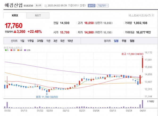 이미지 확대보기2일 한국거래소에 따르면 오전 9시39분 기준 코스피 시장에서 애경산업은 전일 대비 22.48% 오른 1만7760원에 거래되고 있다.