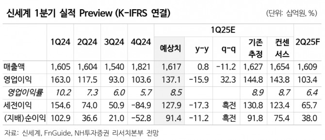 이미지 확대보기신세계의 1분기 연결기준 매출액은 1조 6174억원으로 전년 대비 1% 늘고, 영업이익은 1371억원으로 전년 대비 16% 줄어들 것으로 전망된다.