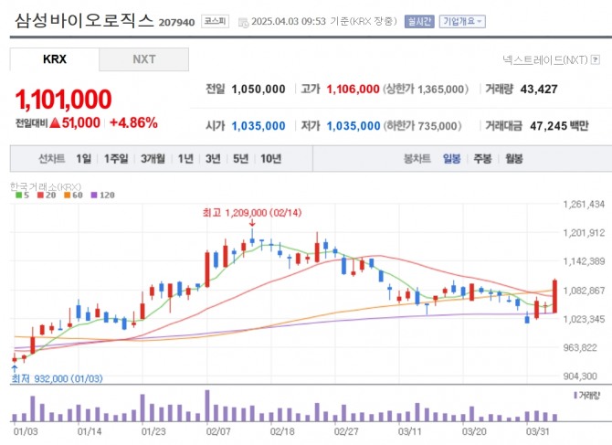 이미지 확대보기3일 한국거래소에 따르면 이날 오전 9시 53분 현재 삼성바이오로직스 주가는 전일 대비 4.86% 오른 110만1000원에 거래되고 있다.