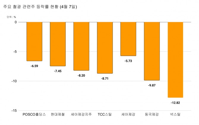 이미지 확대보기7일 한국거래소에 따르면 장 마감 후 철강관련 종목인 POSCO홀딩스는 -6.59%를 비롯해 현대제철 -7.45%, 세아제강지주 -8.20%, TCC스틸 -8.71%, 세아제강 -5.73%, 동국제강 -9.87%, 넥스틸 -12.82% 등 급락했다.