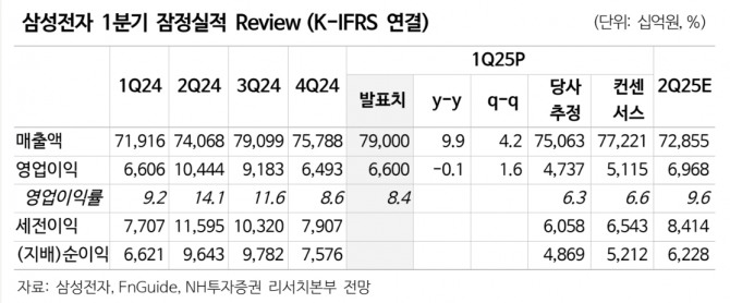 이미지 확대보기삼성전자의 1분기 매출액은 79조원으로 전년 대비 9.9% 늘고, 영업이익은 6조 6000억원으로 전년 대비 0.1% 줄었다. 이는 시장 예상을 큰 폭으로 상회했다. 예상치를 상회한 배경은 환율 효과와 갤럭시 S25 프리미엄 라인 판매 호조에 따른 믹스개선 및 부품 가격 하락에 따른 큰 폭의 수익성이 개선됐다.