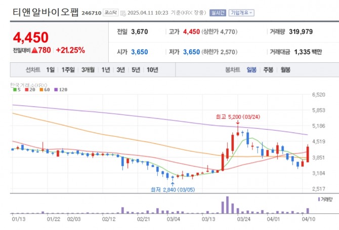 이미지 확대보기11일 한국거래소에 따르면 오전 10시23분 전거래일 대비 21.25% 오른 4450원에 거래 중이다.