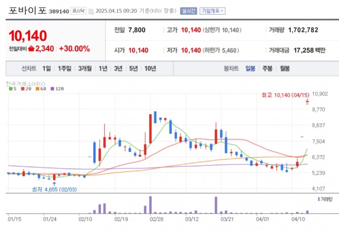 이미지 확대보기15일 한국거래소에 따르면 이날 오전 9시20분 포바이포는 상한가까지 치솟은 1만140원에 거래 중이다. 개장과 함께 상한가로 직행했다.