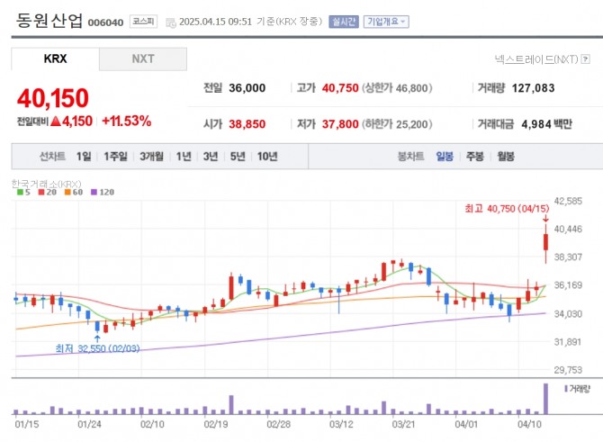 이미지 확대보기15일 한국거래소에 따르면 오전 9시 51분 기준 동원산업은 전장 대비 11.53% 오른 4만150원에 거래되고 있다. 장중에는 4만7520원까지 올라 52주 신고가를 기록했다. 같은 시각 동원F&B도 3.08% 상승 중이다.