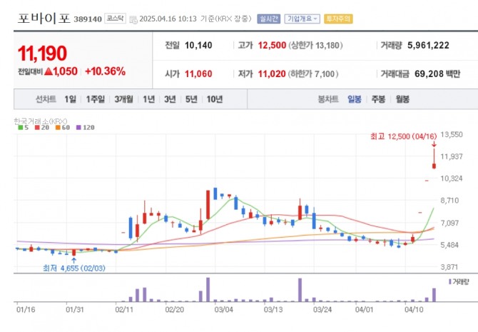 이미지 확대보기16일 한국거래소에 따르면 오전 10시13분 현재 포바이포 주가는 전거래일 대비 10.36% 오른 1만 1190원에 거래 중이다. 포바이포는 지난 14일과 15일 이틀간 상한가를 기록한 바 있다. 11일 종가 6000원과 비교하면 현주가수익률은 89.7% 수준이다.