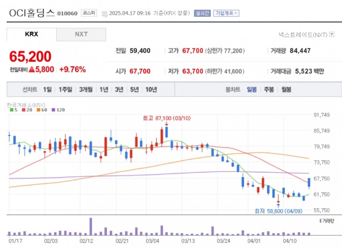 17일 한국거래소에 따르면 이날 오전 9시16분 현재 OCI홀딩스는 전거래일 대비 9.76% 오른 6만 5200원에 거래 중이다. 개장과 함께 전장보다 13.97% 오른 6만 7700원까지 치솟기도 했다.