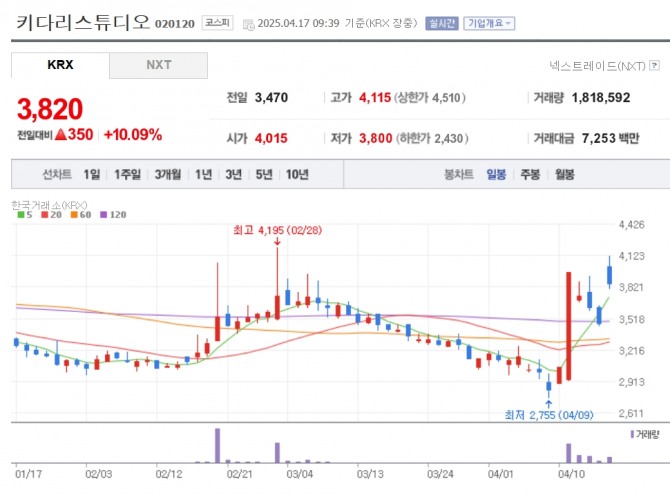 이미지 확대보기17일 한국거래소에 따르면 오전 9시39분 현재 키다리스튜디오는 전거래일 대비 10.09% 오른 3820원에 거래 중이다.