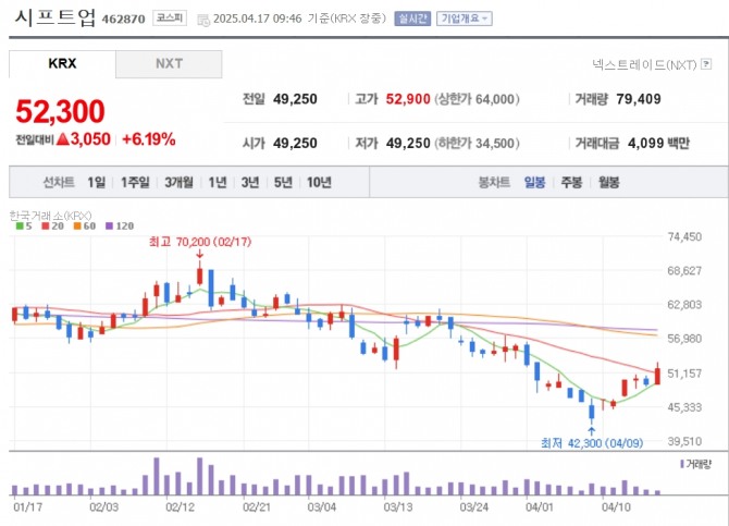 이미지 확대보기17일 한국거래소에 따르면 오전 9시46분 시프트업은 전날 대비 6.19% 오른 5만2300원에 거래되고 있다.