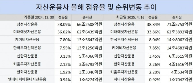 한편 이대로라면 미래에셋은 올해 안에 1위 자리 탈환 가능성도 약해져 보인다. 도널드 트럼프 대통령 취임 후 관세 공포가 커지면서 국내는 물론 해외주식시장이 주춤한 것이 미래에셋에게 직격탄이 됐기 때문이다.