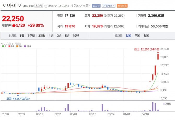 이미지 확대보기18일 한국거래소에 따르면 오전 10시44분 기준 포바이포는 전 거래일 대비 29.89% 오른 2만2250원에 거래되고 있다. 포바이포는 지난14일부터 매 거래일 상한가를 이어왔다.