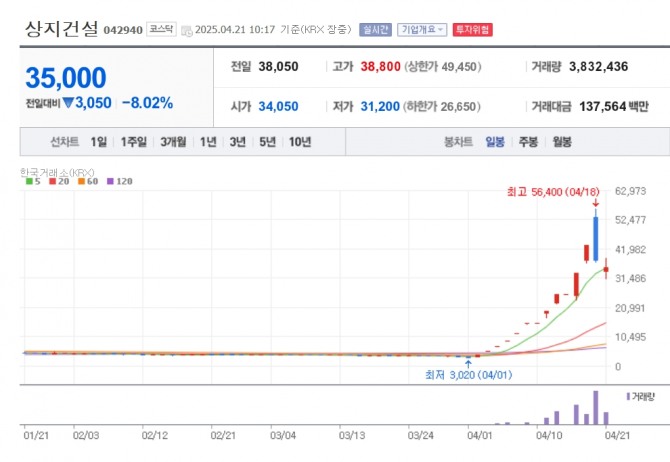 이미지 확대보기21일 한국거래소에 따르면 오전 10시 17분 상지건설은 8.02% 하락한 3만5000원을 기록하고 있다. 이날 장중 -18% 하락한 3만 1200원까지 내려갔다가 매수세가 몰리며 반등하기도 했다.