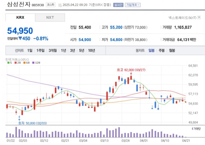 이미지 확대보기22일한국거래소에 따르면 오전 9시20분 삼성전자는 전날 대비 0.81% 내린 5만4950원에 거래되고 있다.