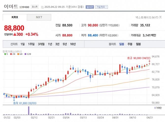 이미지 확대보기22일 한국거래소에 따르면 오전 9시25분 현재 이마트는 전일 대비 0.34% 오른 8만8800원에 거래되고 있다. 장중 9만원까지 오르며 52주 신고가를 경신했다.
