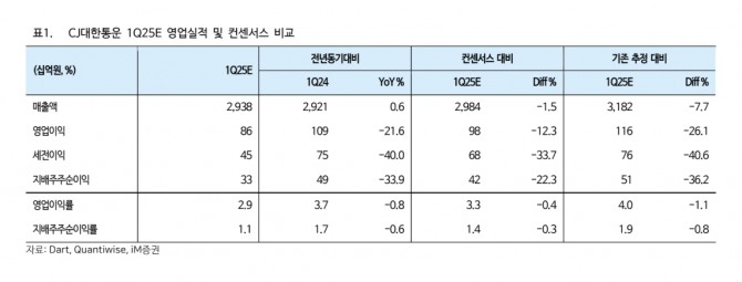 택배 물동량 감소 효과를 반영해 택배 부문 영업이익 추정치를 기존 2420억원에서 1856억원으로 크게 하향 조정했다. 2025년 CJ대한통운의 매출액과 영업이익을 각각 12조 4000억원, 4777억원으로 전망했다. 이는 전년 동기 대비 각각 +2.5%, -10% 수준이다.