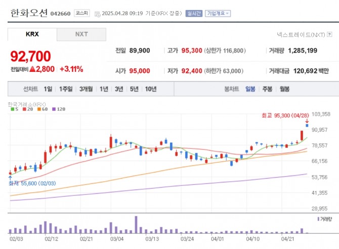 이미지 확대보기28일 한국거래소에 따르면 오전 9시19분 한화오션은 전 거래일 대비 3.11% 오른 9만2700원에 거래 중이다. 한화오션은 이날 장이 열리자마자 9만5300원까지 치솟으며 52주 신고가를 경신하기도 했다.