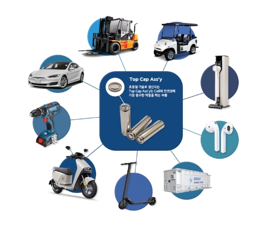 1992년 설립된 성우는 이차전지의 핵심 안전부품을 생산하는 기업이다. 주력 제품인 '탑캡 어셈블리'는 원통형 이차전지의 폭발 및 화재를 예방할 수 있는 상품이다. 이를 통해 배터리셀 내부 온도나 압력이 증가하면 전류를 차단하고 내부 가스를 방출한다.