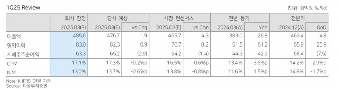 1분기 실적은 매출액 4856억원(전년동기대비 27% 증가), 영업이익 830억원(61% 증가), 지배주주순이익 633억원(43% 증가)을 기록했다.