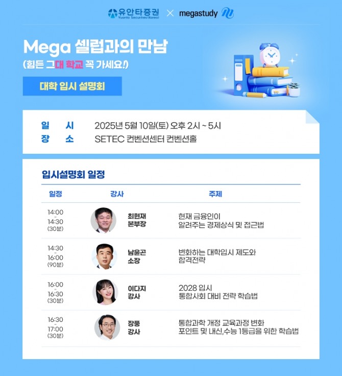 최현재 투자컨설팅본부장의 ‘금융인이 알려주는 경제 상식 및 접근법‘을 시작으로, 이어 남윤곤 메가스터디교육 입시전략연구소장이 ‘변화하는 대학 입시 제도와 합격 전략‘을 주제로 강연한다.