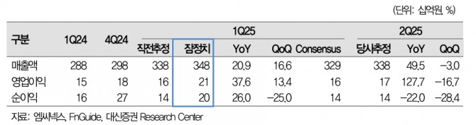 이미지 확대보기엠씨넥스의 1분기 매출액은 3479억원으로 전년 동기 대비 20.9% 증가하고 영업이익은 209억원으로 같은 기간 37.6% 늘어 컨센서스 대비 각각 5.9%, 27.4% 상회했다.