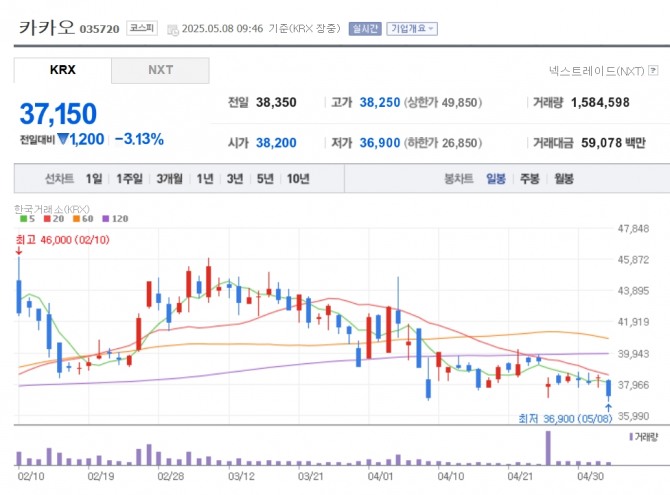 이미지 확대보기8일 한국거래소에 따르면 오전 9시46분 카카오는 전일 대비 3.13% 하락한 3만7150원에 거래되고 있다.
