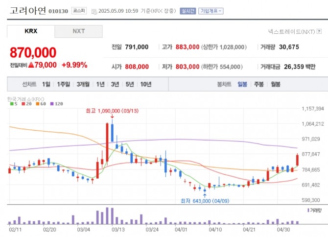 이미지 확대보기9일 한국거래소에 따르면 고려아연은 오전 10시 59분 전 거래일 대비 9.99% 오른 87만원에 거래되고 있다.