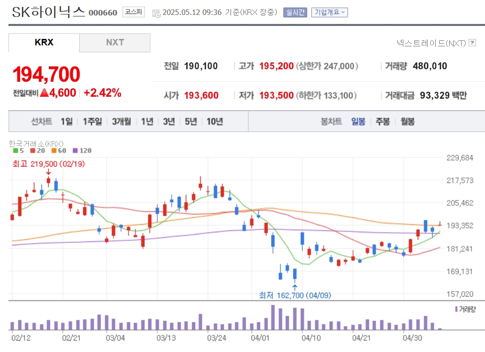12일 한국거래소에 따르면 이날 오전 9시36분 현재 SK하이닉스는 전거래일 대비 2.42% 오른 19만 4700원에 거래 중이다.