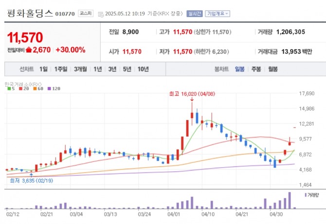이미지 확대보기12일 한국거래소에 따르면 김문수 테마주로 분류되는 평화홀딩스는 10시 19분 전장보다 30.0% 급등한 1만1570원을 기록, 상한가에 거래되고 있다.