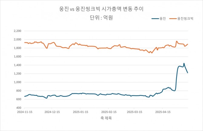 이들 웅진·웅진씽크빅 두종목의 시가총액은 각각 1220억원과 1890억원으로 웅진씽크빅이 669억원 가량 시가총액이 큰 편이다.
