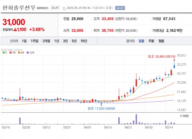 이미지 확대보기19일 한국거래소에 따르면 오전 9시 36분 현재 한화솔루션우와 한화솔루션은 각각 3.68%, 1.43% 오르고 있다. HD현대에너지솔루션은 전 거래일 대비 15.91% 상승 중이고 OCI도 2.56%, 씨에스윈드는 5.22% 강세다.