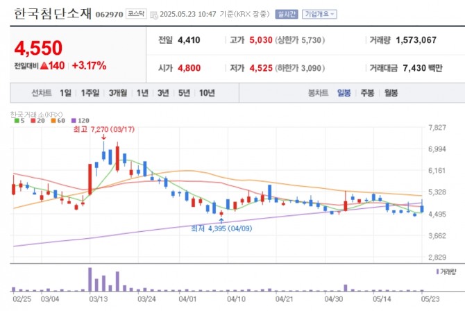 이미지 확대보기23일 한국거래소에 따르면 이날 오전 10시 47분 현재 코스닥시장에서 광통신 부품 제조사 한국첨단소재는 전 거래일 대비 3.17% 오른 4550원에 거래되고 있다. 장중 14% 넘게 오르기도 했다.