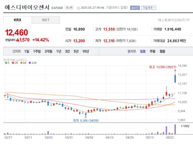 이미지 확대보기27일 한국거래소에 따르면 이날 오전 9시 46분 현재 유가증권시장에서 에스디바이오센서는 전 거래일 대비 14.42% 오른 1만2460원에 거래 중이다. 장 초반 상승폭을 24%까지 키우기도 했다.