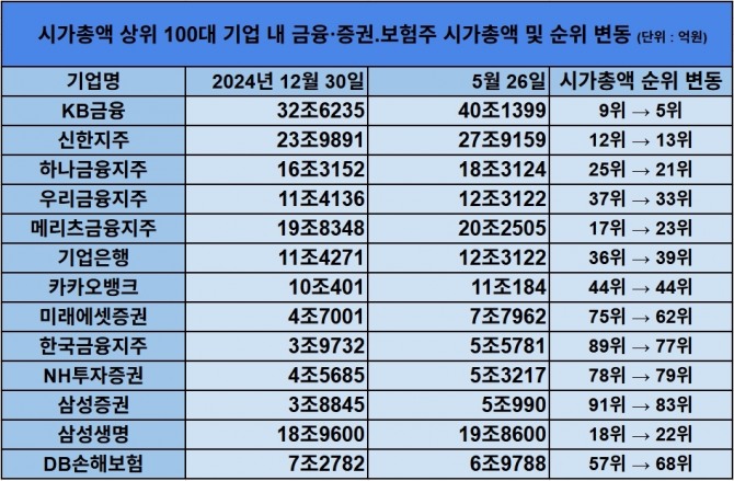 이미지 확대보기27일 한국거래소에 따르면 KB금융은 지난 26일 3.03%(3000원) 오른 10만 2000원에 마감해 올 들어 최고가를 기록했다. 시총은 40조1399억 원으로 한화에어로스페이스(39조3977억 원)를 제치고 5위에 올라섰다. 주가는 지난해 말 대비 23.03%나 올랐다.