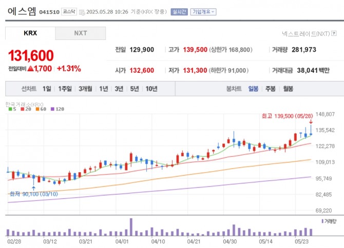 이미지 확대보기28일 한국거래소에 따르면 이날 오전 10시 26분 기준 에스엠 주식은 코스닥 시장에서 1전일 대비 1.31% 오른 13만 1600원에 거래 중이다. 하이브는 0.35% 오른 28만 7500원에 거래 되고 있다. 장중 29만 2500원까지 오르며 52주 신고가를 기록했다. 와이지엔터테인먼트도 장중 8만 5300원까지 오르며 52주 신고가를 경신했다.