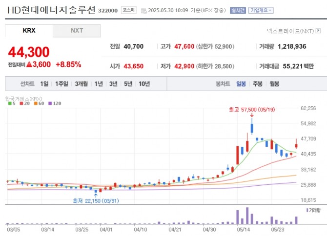 이미지 확대보기30일 한국거래소에 따르면 오전 10시 9분 기준 유가증권 시장에서 태양광 셀·모듈 생산 및 판매업체 HD현대에너지솔루션 주가는 전일 종가 대비 8.85% 오른 4만 4300원을 기록하고 있다. 같은 시각 풍력과 태양광 개발 사업을 하는 대명에너지 와 SK이터닉스 가 각각 5.52%, 4.47% 상승했다.