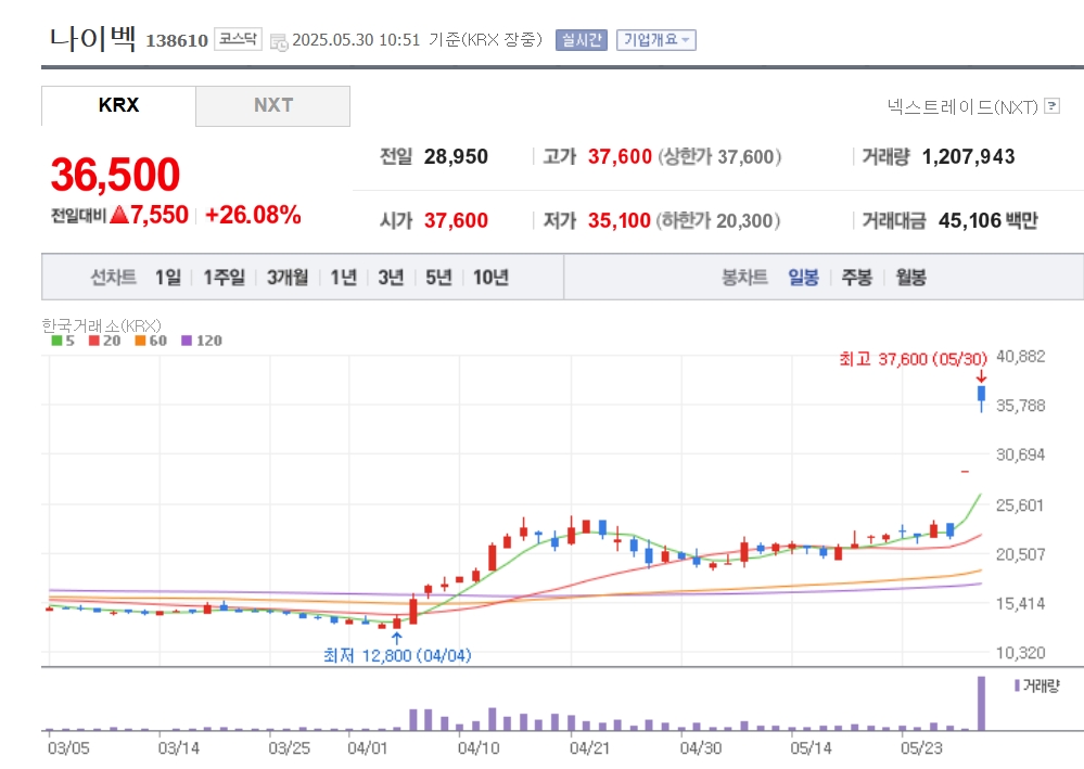 이미지 확대보기30일 한국거래소에 따르면 나이벡은 이날 오전 10시51분 전일대비 26.08% 오른 3만6500원을 나타내고 있다. 오전 9시 5분에는 전일 대비 29.88% 오른 3만7600원을 기록하면서 상한가를 기록했다. 나이벡은 전일 가격제한폭인 6650원이 뛴 2만8950원에 거래를 마쳤다.