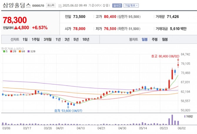 이미지 확대보기2일 한국거래소에 따르면 오전 9시49분 삼양홀딩스는 전거래일 대비 6.53% 상승한 7만8300원에 거래되고 있다. 장중에는 9% 넘게 치솟기도 했다.