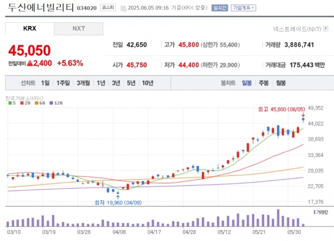 이미지 확대보기5일 한국거래소에 따르면 오전 9시16분 두산에너빌리티는 전거래일 대비 5.63% 오른 4만5050원에 거래되고 있다. 장이 열리자마자 7% 넘게 오르며 4만5800원을 기록해 52주 신고가를 경신했다.