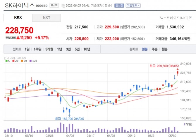 이미지 확대보기5일 한국거래소에 따르면 SK하이닉스는 오전 9시41분 전일 대비 5.17% 오른 22만8750원에 거래되고 있다.