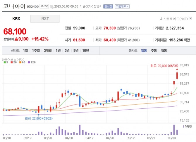 이미지 확대보기5일 한국거래소에 따르면 오전 9시 56분 코스닥 시장에서 코나아이는 전장보다 15.42% 오른 6만8100원에 거래되고 있다. 장중 한때 7만300원을 가리키며 52주 신고가를 경신하기도 했다.
