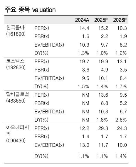 이미지 확대보기2024년 평균 대비 2025년 6월 5일 현재 코스맥스와 한국콜마의 외국인 지분율은 각각 4.9%, 5.4% 높아졌다. 외국인 투자자들이 코스맥스와 한국콜마를 선호하는 이유는 특정 브랜드와 카테고리의 인기 상승과 관계없이 안정적인 실적 창출이 가능하기 때문이다. OEM/DOM 기업은 브랜드사 대비 영업이익 레버리지 효과는 약하지만, 글로벌 뷰티 기업들이 공급망 다변화와 시장 대응 속도를 위해 아웃소싱을 늘리고 있다는 점이 이를 상쇄한다.