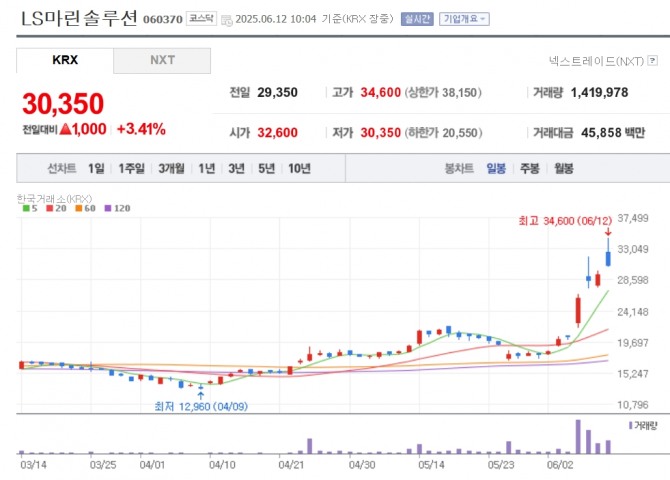 이미지 확대보기12일 한국거래소에 따르면 LS마린솔루션은 이날 오전 10시 7분 현재 전 거래일 대비 3.41% 오른 3만 350원에 거래되고 있다. 장중 3만4600원까지 오르기도 했다.