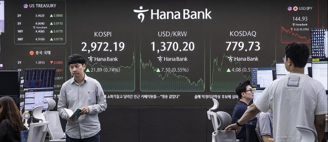 이날 한국거래소에 따르면 코스피지수는 전 거래일 보다 0.74%(21.89포인트) 오른 2972.19에 거래를 마감했다. 하락 출발한 코스피는 장중 상승 전환하더니 2970선을 돌파했다. 3000포인트 까지 30포인트가량 남았다.