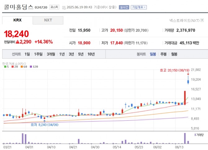 이미지 확대보기19일 한국거래소에 따르면 오전 9시 43분 현재 콜마홀딩스는 전날에 비해 14.36% 오른 1만8240원에 거래되고 있다. 콜마홀딩스는 전날 29.46% 오르며 상한가를 기록한 바 있다.