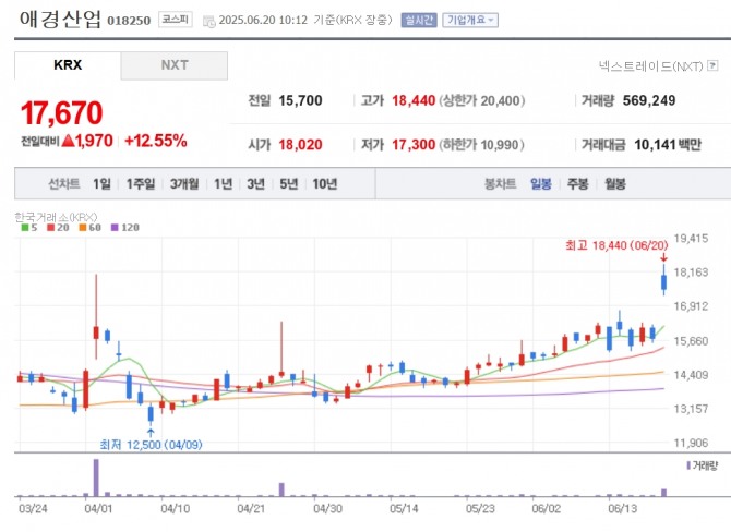 이미지 확대보기20일 한국거래소에 따르면 오전 10시 12분 현재 애경산업은 전 거래일 대비 12.55% 오르고 있다. 애경케미칼은 12.10% 오른 1만 7600원에 거래 중이다.
