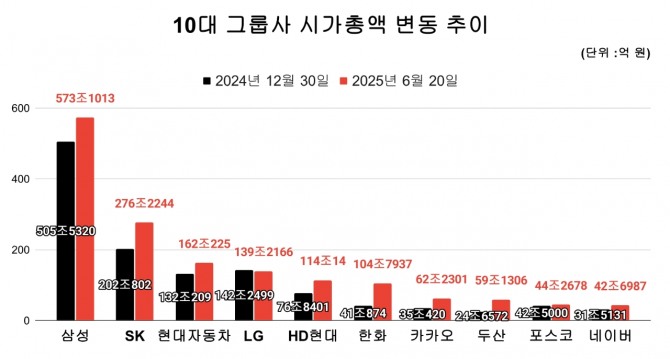 같은 기간 두산그룹도 139.81%(34조4734억 원) 불어나 59조1306억 원으로 마감해 시총 60조 돌파를 코앞에 두고 있다. 시총 순위도 11위에서 8위로 3계단 올라섰다. 한편 시총 6위였던 셀트리온은 11위로 밀려났다.