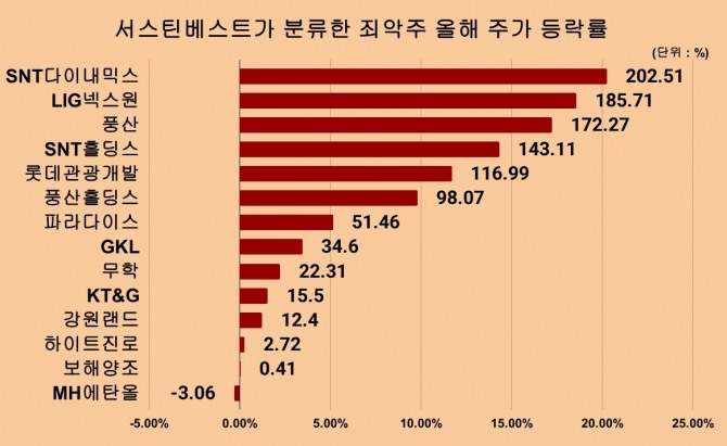 글로벌이코노믹이 집계한 결과 서스틴베스트가 분류한 14개의 죄악주 가운데 대인지뢰를 만드는 SNT 다이내믹스는 지난해 말부터 지난 23일까지 202.51%(3만7890원) 오른 5만6600원에 거래를 마감했다.