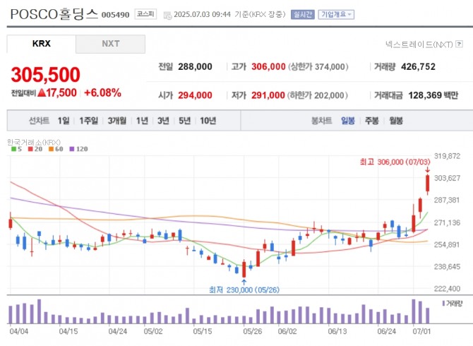 3일 한국거래소에 따르면 이날 오전 9시 44분 현재 POSCO홀딩스 주가는 전일 대비 6.08% 상승한 30만5500원에 거래되고 있다.