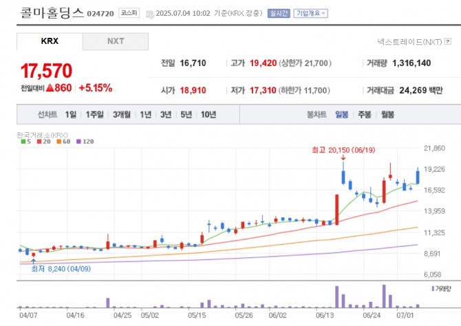 이미지 확대보기4일 한국거래소에 따르면 이날 오전 10시 02분 기준 콜마홀딩스 주식은 코스피시장에서 전일보다 5.15% 오른 1만7570원에 거래되고 있다.