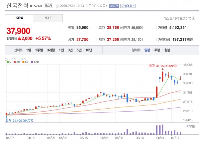 이미지 확대보기4일 한국거래소에 따으면 오전 10시 23분 현재 한국전력은 전 거래일 대비 5.57% 오른 3만7900원에 거래 중이다.