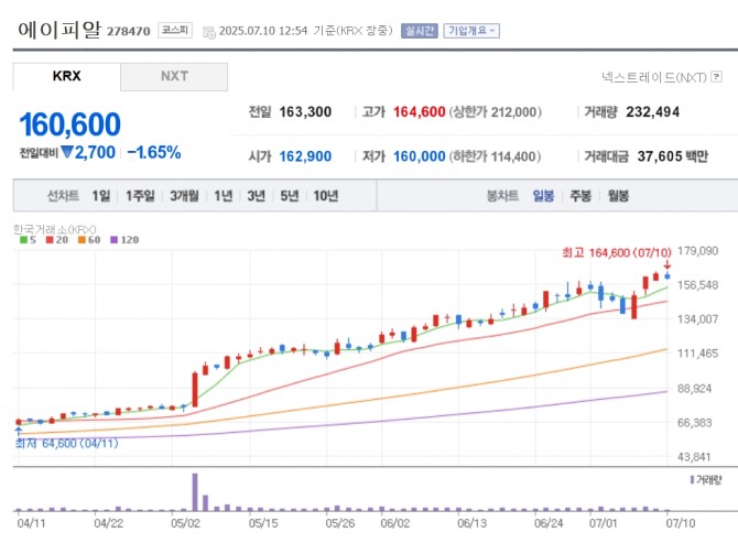 이미지 확대보기10일 한국거래소에 따르면 이날 오후 12시54분 에이피알은 전장 대비 1.65% 하락한 16만600원에 거래 중이다. 장중 16만4600원까지 상승하면서 52주 신고가를 갈아치웠다. 에이피알 주가는 올 들어서만 226.6% 치솟았다.